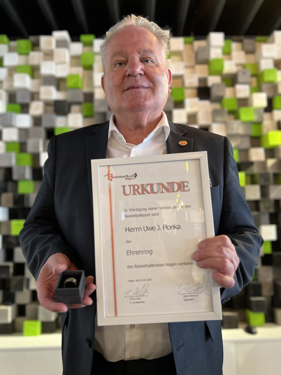 Der Basketballkreis Hagen hat den Präsidenten des Westdeutschen Basketball-Verbands Uwe J. Plonka mit dem Ehrenring ausgezeichnet.